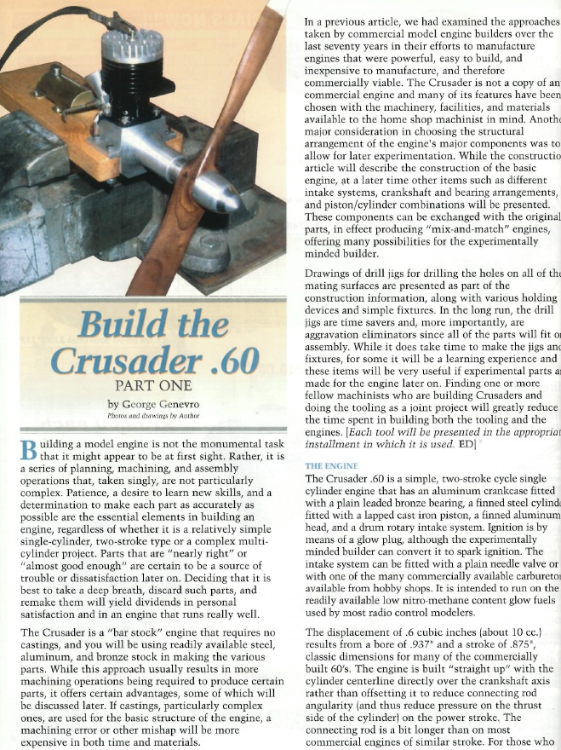 The full five-part series, Build the Crusader .60 by George Genevro, is once again available! This is a scan of the original article. You will receive a printed copy. The single cylinder, two-stroke engine is made entirely from bar stock, no castings required. The engine is a time-proven design, described and detailed by one of the masters of model engineering, George Genevro.